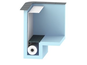 Het oprolmechanisme zit in een daarvoor gebouwde nis in de bodem van het zwembad. De nis kan worden afgedekt met een plaat in PVC of composiet en een ronde buis zorgt voor de geleiding van de lamellen. Een extra L-profiel ondersteunt de afdekplaat.